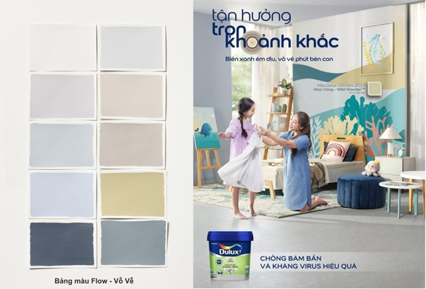 Với bảng màu Flow – Vỗ về sẽ giúp thực hiện mong muốn thiêng liêng đó của các bậc phụ huynh. Cảm hứng để tạo nên bảng màu này chính là sự uyển chuyển, nhịp nhàng của thủy triều kết hợp cùng với những yếu tố xung quanh khác như màu vỏ sò, cát biển… Qua đó mọi thành viên trong gia đình sẽ được sáp lại gần nhau, xua tan nỗi lo về khoảng cách.
