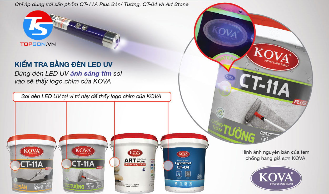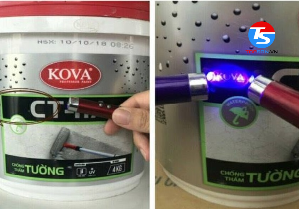Sơn Kova chính hãng có tem chống hàng giả chìm, được thiết kế ẩn ở vị trí phía trên logo TUV.PSB đối với dòng CT-04 hoặc vị trí phía trên Logo Waterproof với dòng CT-11A. Khi soi đèn tia UV vào vị trí này, nếu là hàng chính hãng, logo KOVA sẽ hiện ra với chữ trắng – nền màu tím. Ngược lại, với hàng giả, bạn sẽ không thấy các dấu hiệu bảo an trên.